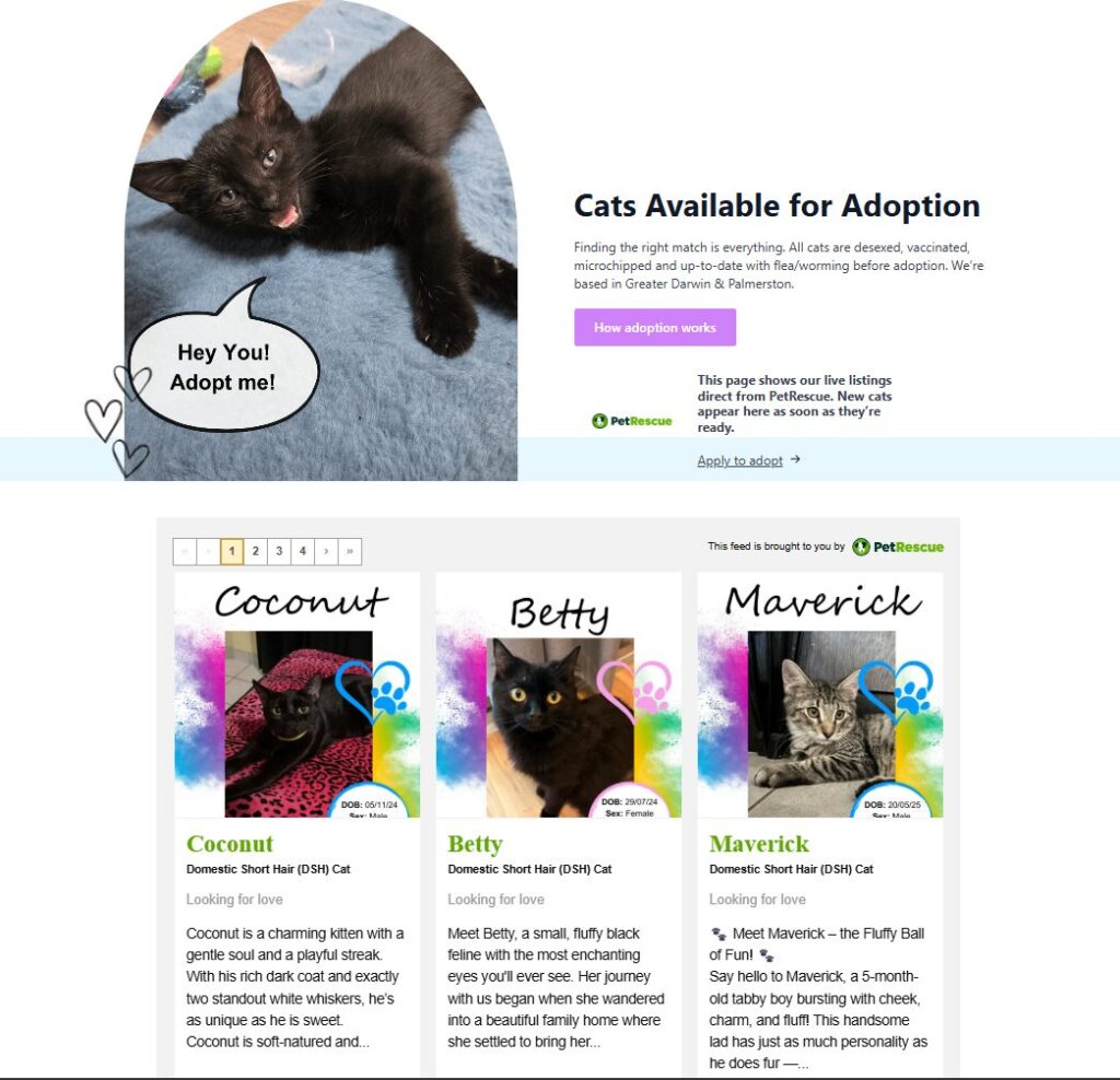 Live PetRescue feed integration for the “Cats Available for Adoption” section