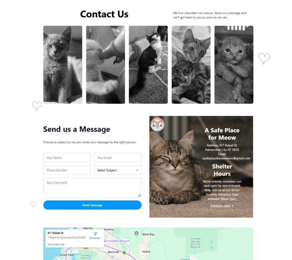 Fully responsive website design optimised for Multiple devices.Dynamic “Cats Available for Adoption” page integrated with PetRescue for live adoption listings.Custom contact and enquiry forms for adoption, foster care, volunteering, and general enquiries.